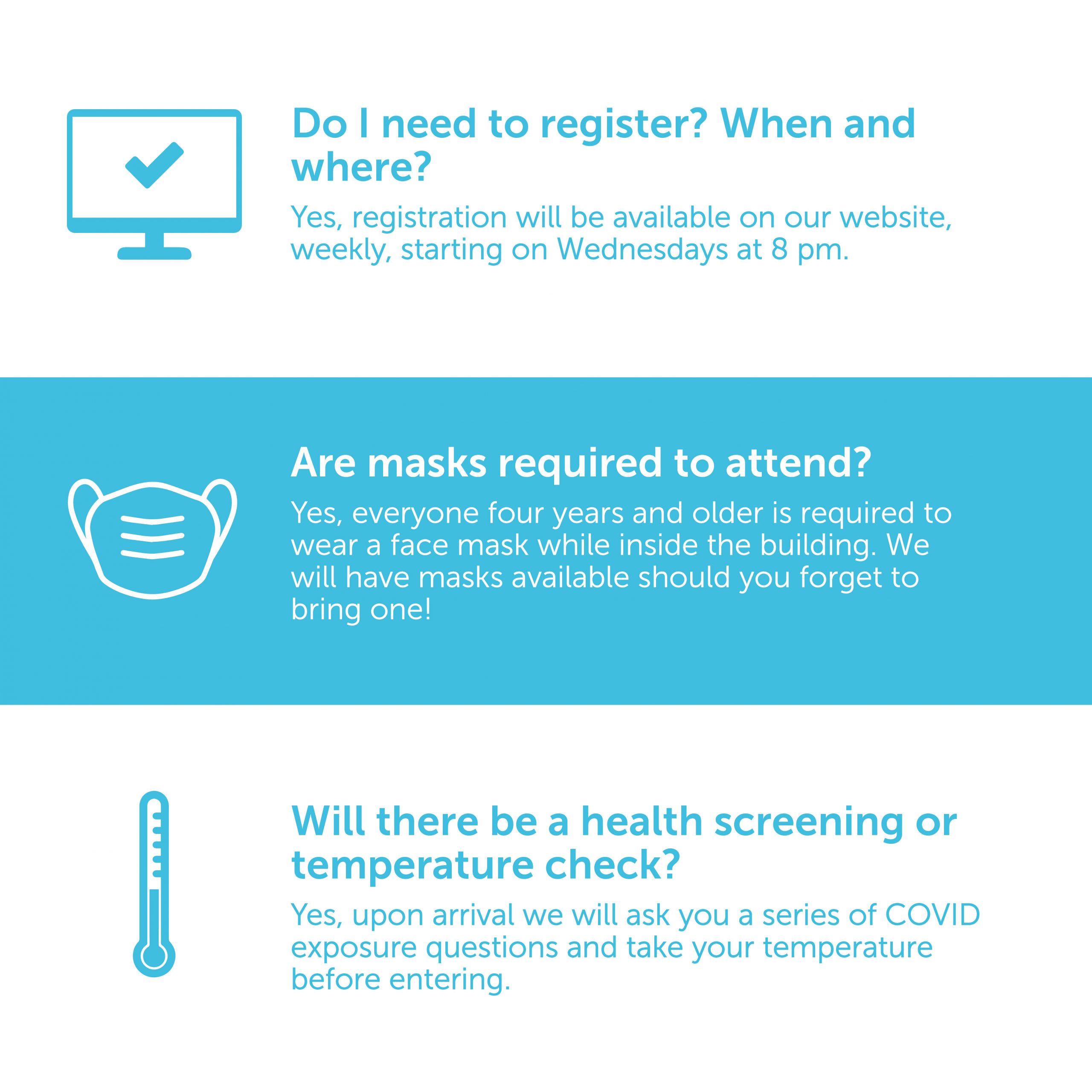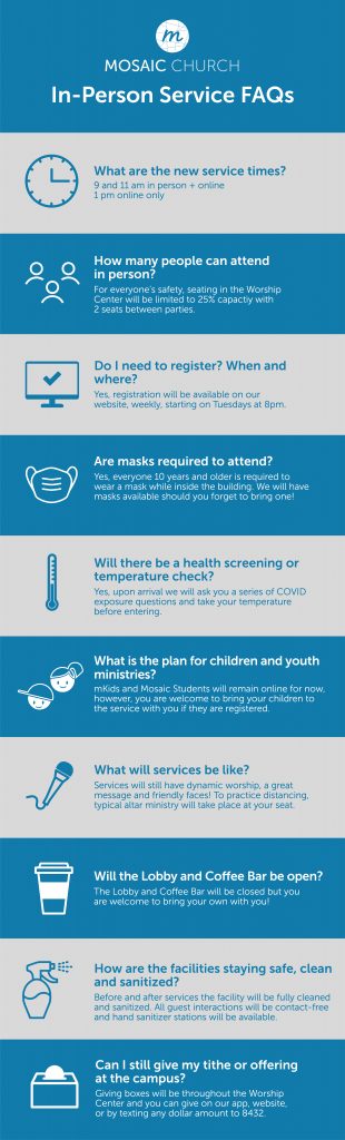While how you get to your seat, your accessories (remember your mask!), and the way in which you navigate the building may look different, you can expect the same welcoming and dynamic environment, all while keeping safety paramount. There is no substitute for the gathered people of God, and we can’t wait to have you with us! Scroll down to find registration information in addition to answers for some frequently asked questions.