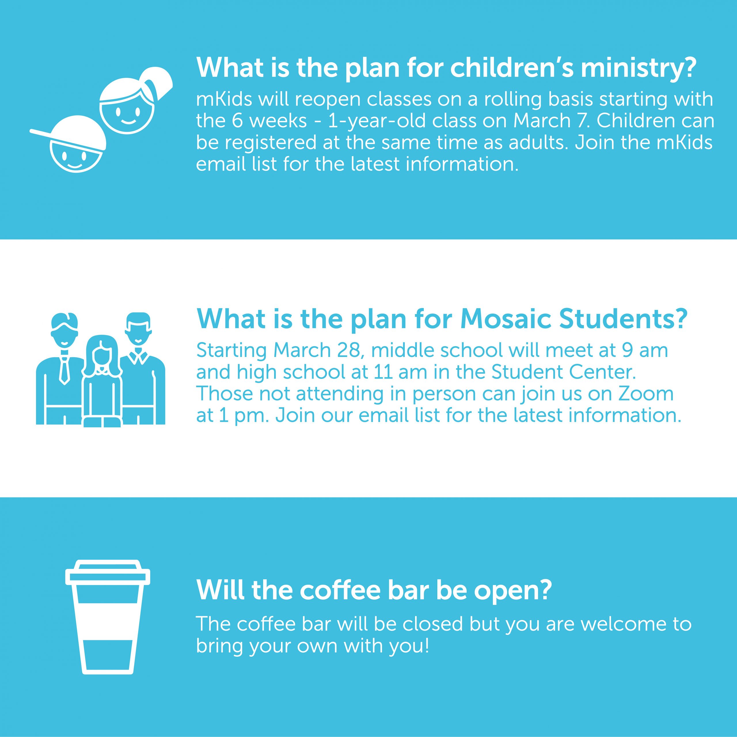 mKids classrooms for ages 6 weeks – 4-years-old and 1st – 5th graders will be open. Classrooms will continue to be reopened on a rolling basis. Registration for mKids will be available when registering adults for service. *Please sign up for the mKids email list to get up-to-date information.