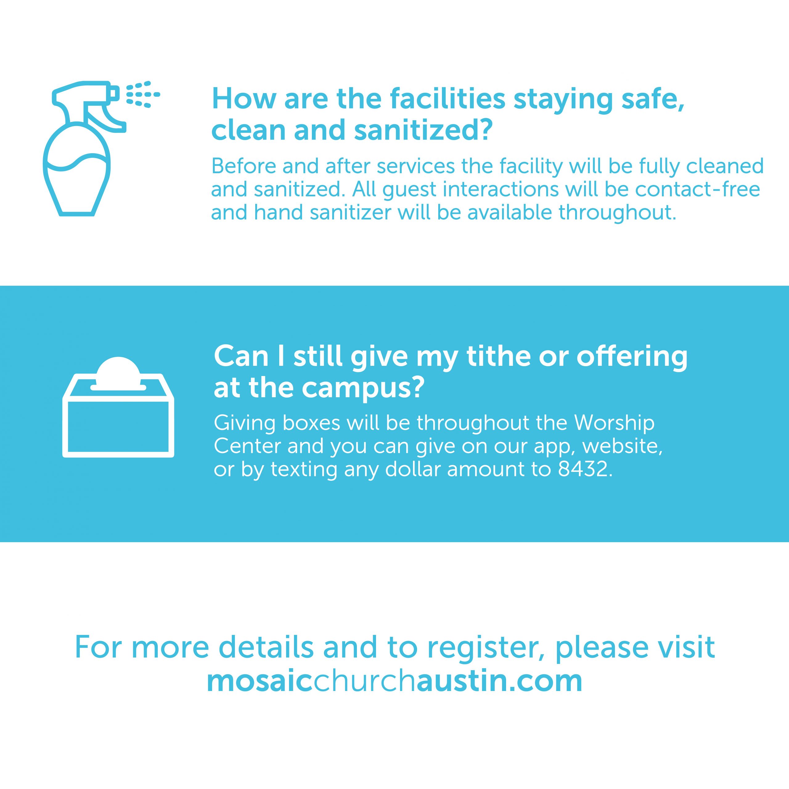 We will not pass the offering plate in our services for the time being. To give in-person, we have giving boxes located throughout the Worship Center. You can also give by texting any dollar amount to 84321, visiting our website mosaicchurchaustin.com/give or via the Church Center App.