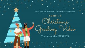 Would you consider sending in a short, “Merry Christmas” video to be shown on Christmas Eve? I would love to be able to see you, your family, your children, and so would a whole lot of other people. I think seeing you would help us all celebrate just a little bit better. It doesn’t matter how long or how short you’ve been at Mosaic, we would just love to see you!
